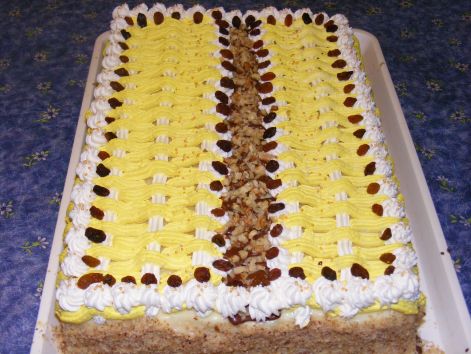 A kakós piskótalapot tegyük alulra, locsoljuk meg a sziruppal és tegyük rá a krém 1/4 részét. Erre szórjunk pirított, durvára vágott diót. Aki szereti mazsolát is szórhat rá, amit előtte áztasson be rumba. Ráhelyezzük a diós piskóta lapot, ugyan úgy járunk el, mint az előzőnél, majd a sárga piskóta lapot tesszük felülre. Én a tetejére szoktam néhány percer egy kis nehezéket tenni, ami összetömöríti kicsit a rétegeket, stabilabb lesz a tortánk. Ennek a tetejét is meglocsoljuk sziuppal majd a krémmel. A piskóta oldalát a maradék krémmel bekenjük.