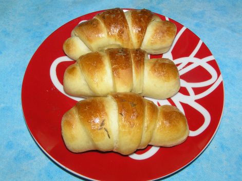 Az élesztőt langyos tejben felfuttatjuk. A tészta hozzávalóit összegyúrjuk, jól kidolgozzuk. Hagyjuk langyos helyen a duplájára kelni. Kinyújtjuk a tésztát ás feldaraboljuk úgy, hogy háromszügeket kapjunk. Olvasztott margarinnal megkenjük és felcsavarjuk a szélesebb oldalról a keskenyebb felé. A tetejét felvert tojással megkenjük és sóval elkevert köménymaggal meszórjuk. Előmelegített sütőben készre sütjuk.