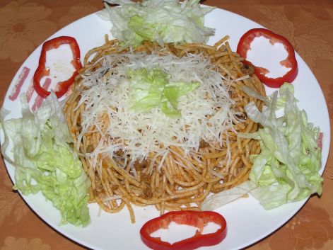 Előkészítjük az alapanyagokat. A vöröshagymát megtisztítjuk, és finomra vágjuk. A gombát megmossuk, apróra vágjuk. A fokhagymákat megtisztítjuk, összetörjük. Az olajon a vöröshagymát megpirítjuk, majd rátesszük a fokhagymát, ezt felengedjük 0,5 dl vízzel. A darálthúst ( én ezt használtam, de klasszikusan gépsonkával kell készíteni) hozzáteszzük, fűszerezzük, majd folyamatos kevergetés mellett addig pároljuk, míg teljesen ki nem fehéredik. Hozzátesszük a felaprított gombát és újabb 10-15 percig pároljuk. Hozzákeverjük a sűrített paradicsomot, ha szükséges, vízzel vagy ketchuppal hígítjuk még, ha túl sűrű. Közben a vízben feloldjuk a sót, hozzáadjuk az étolajat és kifőzzük benne a tésztát. Melegen tálaljuk, és sajtttal megszórjuk a tetejét. A szószt lehet a tésztára is tenni, de akár össze is keverhetjük vele tálalás előtt.